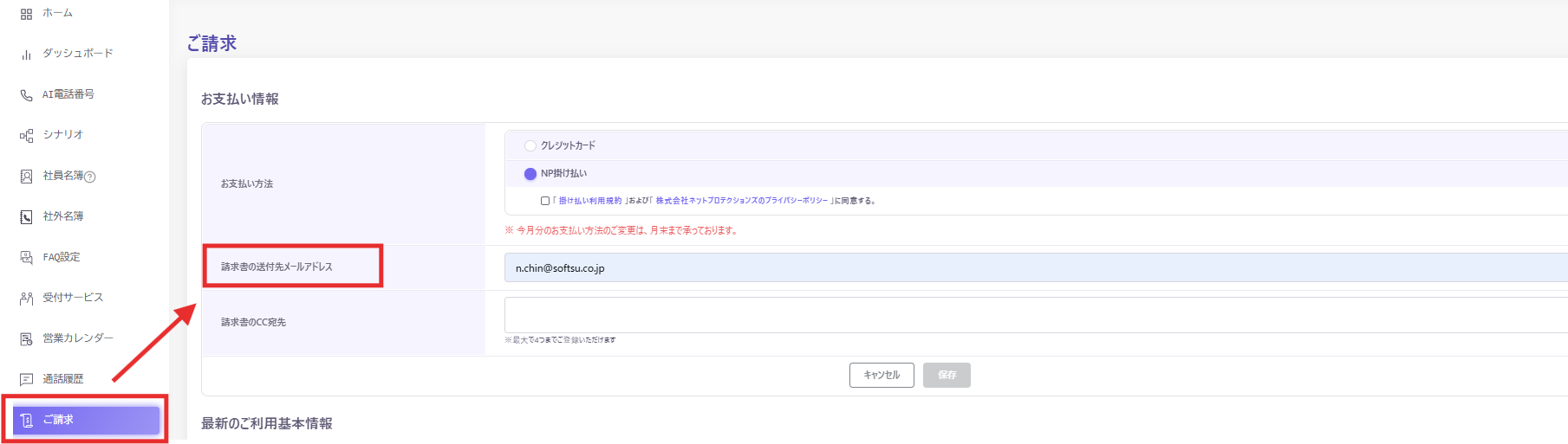 請求書送付先のメールアドレスの変更及びメールアドレスを追加することが可能です。
