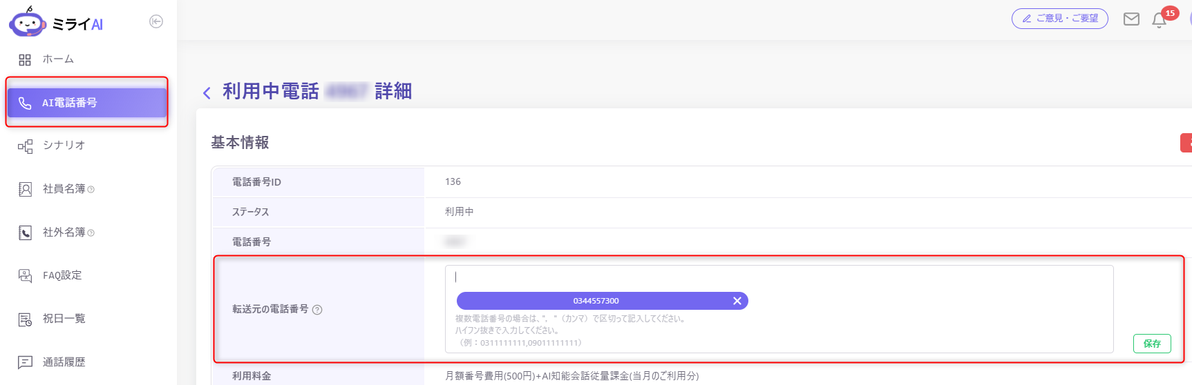 2)左メニューのAI電話番号をクリックし、050番号の行をクリック>「転送元の電話番号」に既存の電話番号を入力してください。