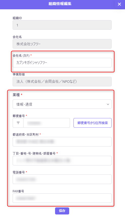 マイページ>設定>組織情報より、組織の住所変更・電話番号の変更が可能です。