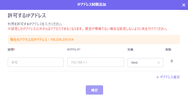 IP制限の新規登録や、登録しているものが一覧で表示できます。