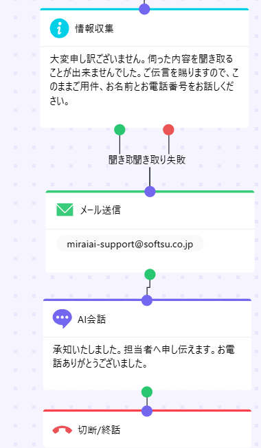 以下ブロックのメール送信ブロック前の「情報収集ブロック」でAIが発話途中にお客さまが切電された場合、メール送信はされません。