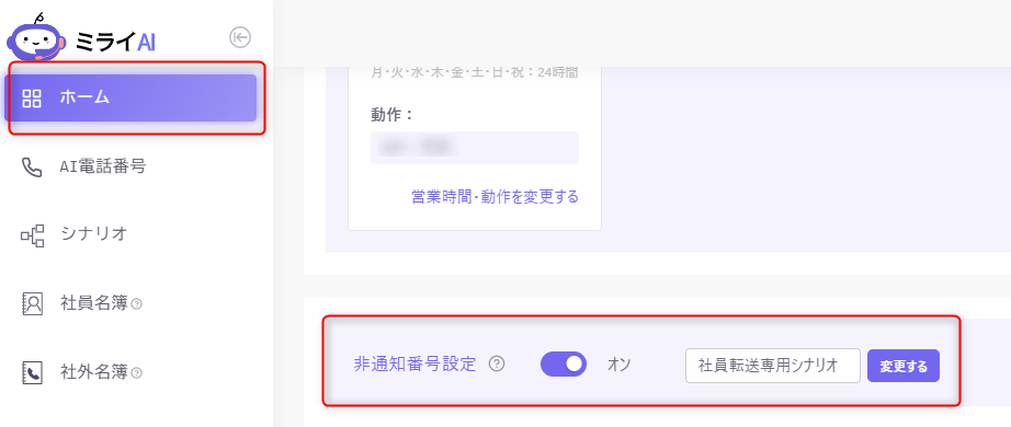 ver1.7.18(2024年12月23日リリース) ミライAIサポート 2024年12月19日 08:17 更新 新機能 非通知番号から着信があった場合の着信フローを設定する機能を追加しました。マイページ>ホーム>「非通知番号設定」より設定可能です。 AIが発話した後に電子音を入れる機能を追加しました。※カスタマイズシナリオ限定 でご利用いただけます。マイページ>シナリオ>新規作成>カスタマイズシナリオご選択後「AI音声の設定」より変更可能です。本機能により、お客様の発話を促す効果を期待できます。 シナリオインポート/エクスポート機能を追加しました。 機能改善 音声認識の精度を改善しました。 関連記事 STARTプラン向け マニュアル