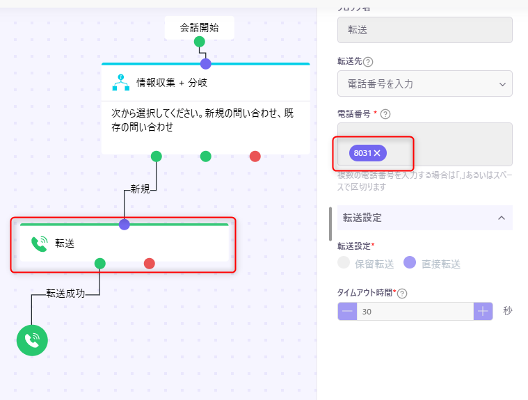 ③転送ブロックの設定で、転送先の電話番号にBlueBeanの「ACD」の番号を入力して保存します。