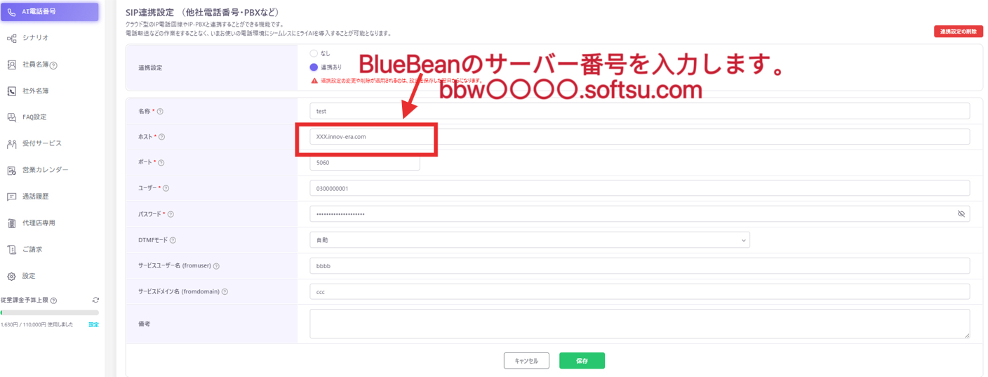 ②マイページ>AI電話番号から、連携したい050番号をクリックしSIP連携設定で、①で作成したBlueBeanの内線番号を入力して保存します。※設定は翌日反映されます。