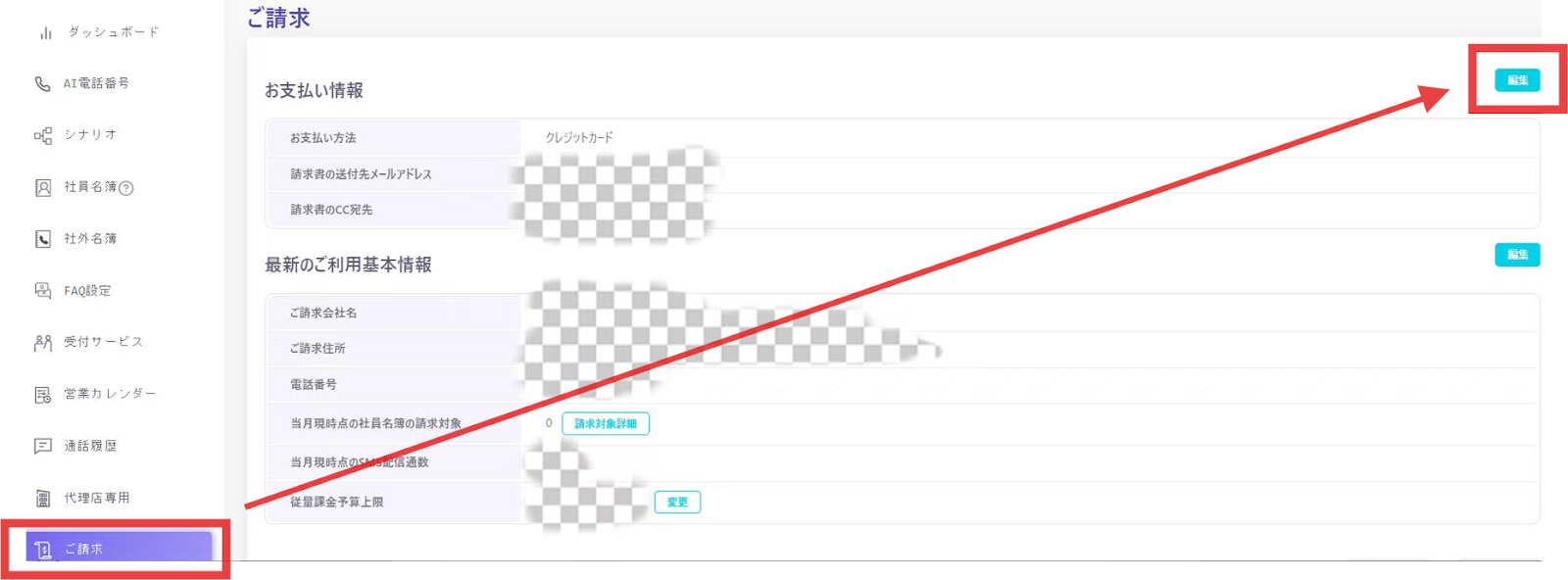 マイページログイン>ご請求>右上水色「編集」ボタンをクリック>